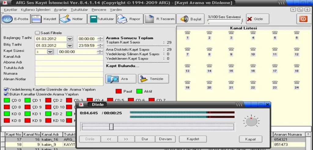 - Kanallardan her birinde görüşme başlaması ile kayıtlar başlamakta, görüşme sonlanınca bitmektedir.